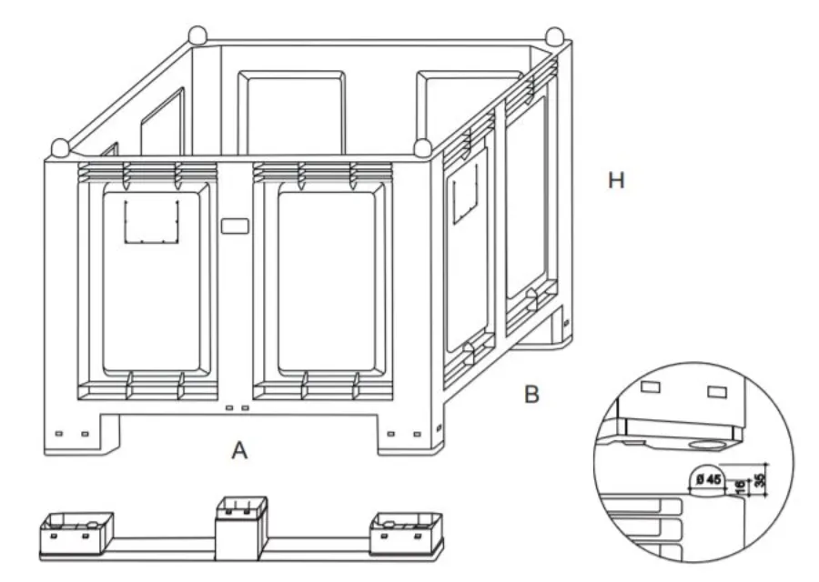 Παλετοκιβώτιο με 2 τραβέρσες . Διάτρητο (2,64cm διάμετρος τρύπας). Κατάλληλο για άμεση επαφή με τρόφιμα.